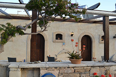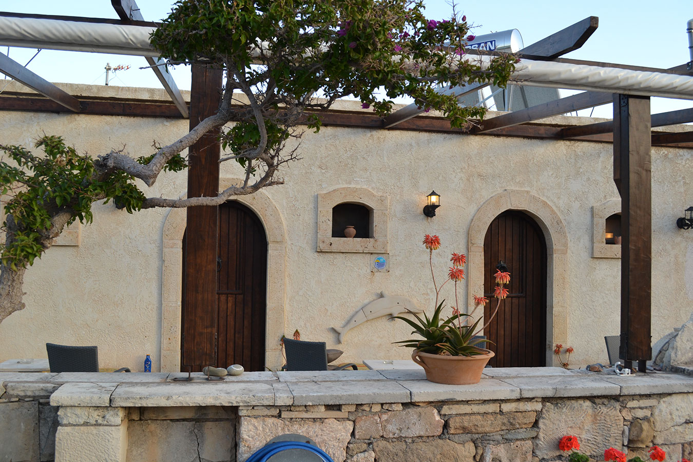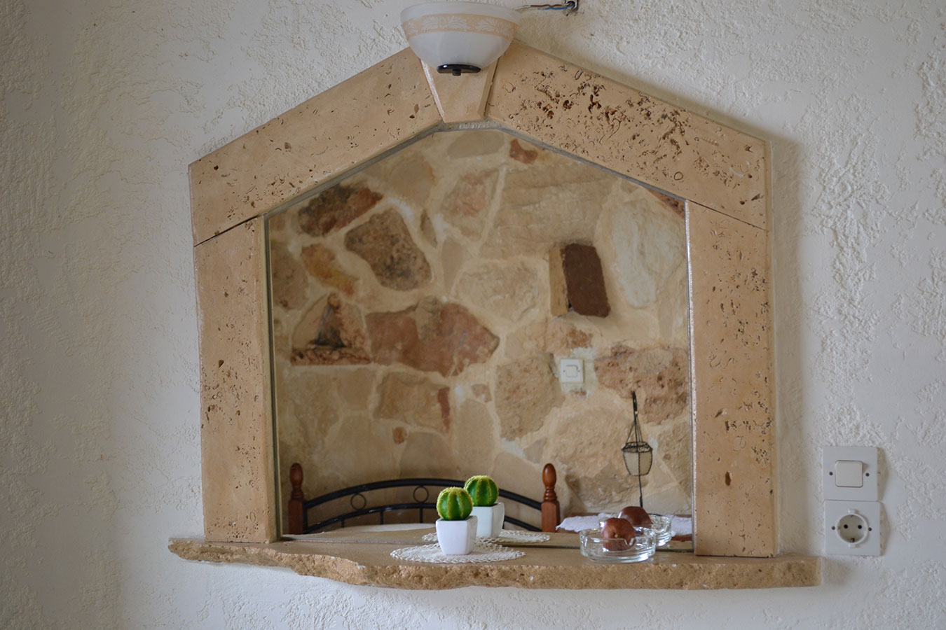 Τα δωμάτια μας είναι επενδυμένα στους τοίχους από φυσικές πέτρες με καθρέπτες ανάμεσά τους και έχουν ξύλινες οροφές. Στους εσωτερικούς τοίχους του συγκροτήματος και στο τοιχίο της αυλής, ιδιαίτερη εντύπωση προκαλούν οι λαξευτές πέτρες με τα διάφορα θέματα επάνω τους.